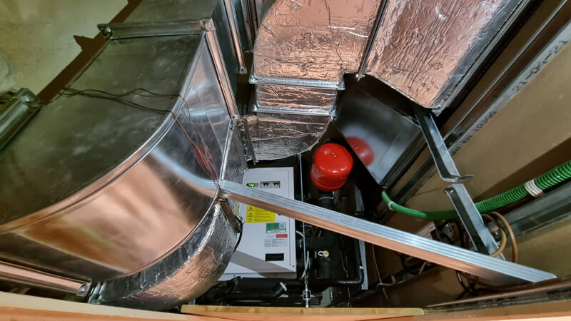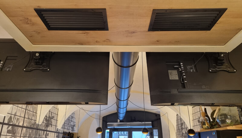 In questo nuovo locale in centro a Trento abbiamo installato un impianto di ventilazione meccanica controllata per il ricambio dell’aria, il riscaldamento e raffrescamento ambiente mediante canale microforato a soffitto con colore personalizzato. La pompa di calore acqua-acqua e l’unità di ventilazione sono state installate nel controsoffitto.